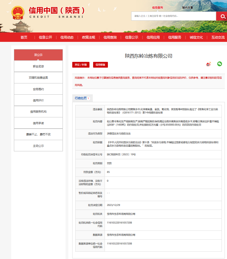 宝鸡市生态环境局凤翔分局公布的处罚信息显示,陕西东岭冶炼有限公司熄焦水中,化学需氧量、氨氮、氰化物、挥发酚等4项指标,超过了《炼焦化学工业污染物排放标准》(GB16171-2012)表1中间接排放标准。