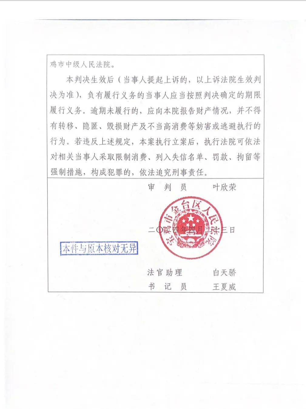 下一步,金台区人民法院速裁审判庭将立足“立审执一体化”机制,以试行诚信履行告知前置改革为契机,坚持问题导向,充分发挥首创精神,不断健全立审执衔接配合机制,积极探索审判执行工作新模式,落实新举措,切实增强人民群众司法获得感、幸福感。下一步,金台区人民法院速裁审判庭将立足“立审执一体化”机制,以试行诚信履行告知前置改革为契机,坚持问题导向,充分发挥首创精神,不断健全立审执衔接配合机制,积极探索审判执行工作新模式,落实新举措,切实增强人民群众司法获得感、幸福感。