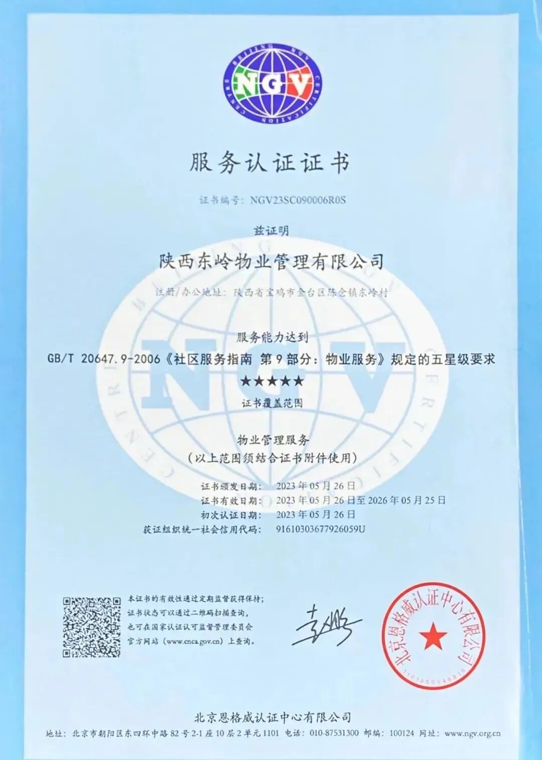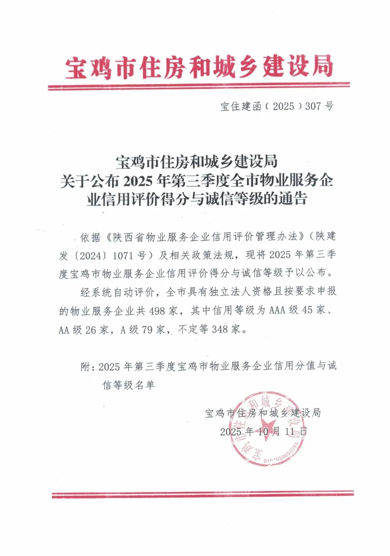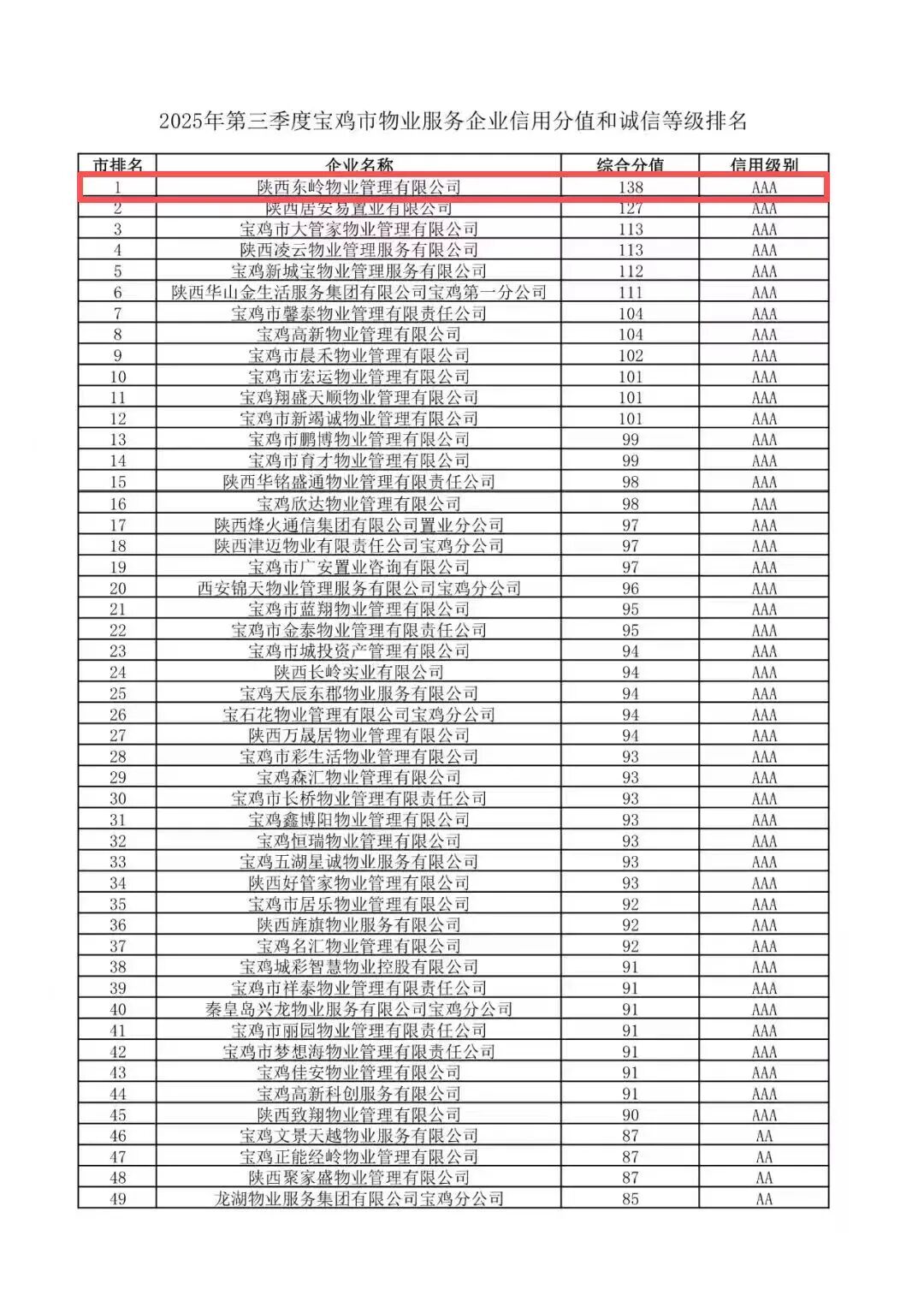 2025年10月11日,宝鸡市住房和城乡建设局发布了《宝鸡市住房和城乡建设局关于公布2025年第三季度全市物业服务企业信用评价得分与诚信等级的通告》【宝住建函﹝2025﹞307号】。凭借诚实守信、依法经营、恪守专业的企业文化和工作成果,东岭物业综合分值138分,信用级别为AAA。