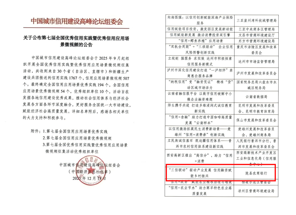 12月13日,中国城市信用建设高峰论坛在浙江省台州市召开,论坛正式发布了第七届全国优秀信用实践暨优秀信用应用场景微视频名单。陇县“信用+金融”应用场景获评优秀实践案例。