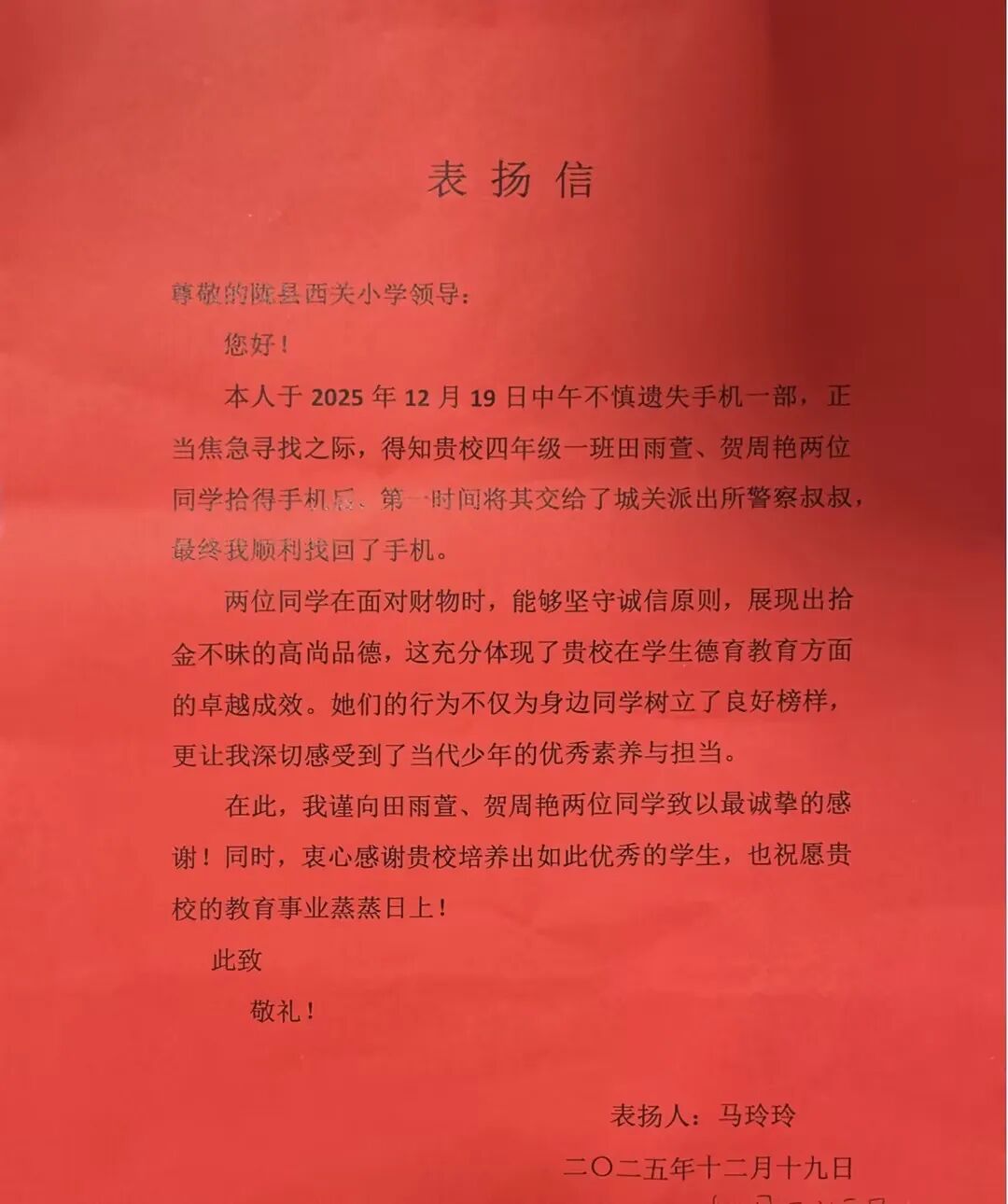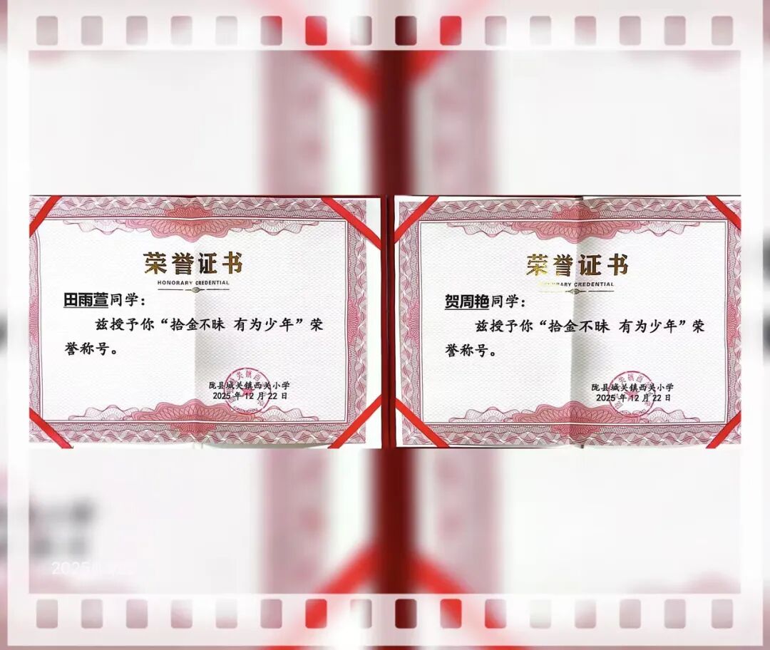 朔风送寒浸冬日,美德暖心满校园。陇县城关镇西关小学的初冬校园里,一桩拾金不昧的善举,如暖阳破雾,既点亮了少年的赤诚底色,更彰显了学校德育深耕的丰硕成果。四(1)班贺周艳、田雨萱两位同学的行为,正是优良校风滋养下,少年向上向善的生动写照。